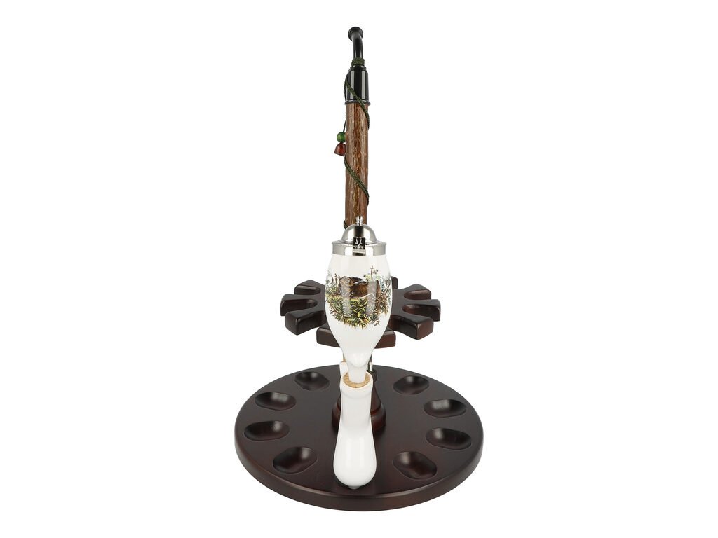 Keramická dýmka BPK Proseč. Porcelánka s loveckým motivem je ručně vyrobená. Keramická část dýmky má lesklý glazurovaný povrch. Na čelní straně hlavy dýmky najdeme barevný potisk se zajíci. Porcelánová fajfka s dřevěným troubelem ukončená akrylátovým náustkem je zdobená omotanou šňůrkou ukončenou dřevěnými korálky. Hlavu dýmky uzavírá chromové víčko, které je zdobené jemným gravírováním. Keramická dýmka je dodávaná v dárkové krabičce. Zobrazený stojánek není součástí balení dýmky.Filtr/chladič: ne