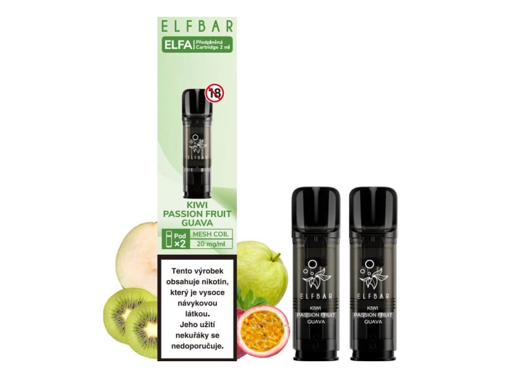 Exotická kombinace lahodného kiwi, nevšední marakuji a guavy... Předplněné cartridge Elf Bar ELFA obsahují 2ml liquidu o síle nikotinu 20mg. Cartridge obsahují prvotřídní liquid s nikotinovou solí, díky které dochází k rychlejší a kvalitnější vstřebatelnosti = bez dráždivého pocitu v krku oproti klasickým liquidům. Nedílnou součástí cartridge je spirálka Mesh pro rychlejší žhavení, rovnoměrné odpařování, vynikající chuť liquidu a větší tvorbu páry. Poměr 50VG/50PGDoplňkové parametry