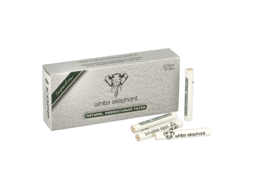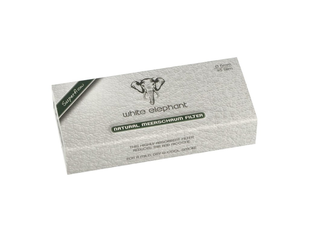 Meršánové filtry do dýmky White Elephant Meerschaum. Meršánové slim filtry jsou funkčně stejné jako filtry uhlíkové, ale jsou vyrobené z přírodního materiálu - rozdrceného meršánu, tím pádem jsou bez chemických látek. Filtry Meerschaum snižují množství přijímaného dehtu, nikotinu, neovlivňují chuť a dopřejí Vám suché a chladné kouření.; Průměr filtru: 6 mm; Délka filtru: 40 mm; Obsah balení: 45 ks filtrůDoplňkové parametry