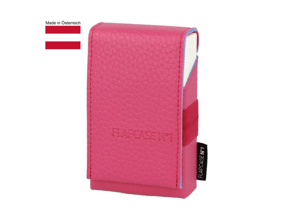 Kožené pouzdro na cigarety s gumou na zapalovač ručně vyrobené v Rakousku. Praktické pouzdro Flapcase na celou krabičku cigaret klasické velikosti King Size (80 mm) je vyrobené z kvalitní kůže. Růžový povrch pouzdra má jemnou texturu. Vypadnutí krabičky je zajištěno zapínáním pouzdra na magnet. Po celém obvodu pouzdra je guma, za kterou můžeme vložit zapalovač. Pouzdro je dodávané v dárkové plastovém sáčku.Vnitřní prostor pouzdra pro krabičku (Š x H x V): 55 x 22 x 91 mm