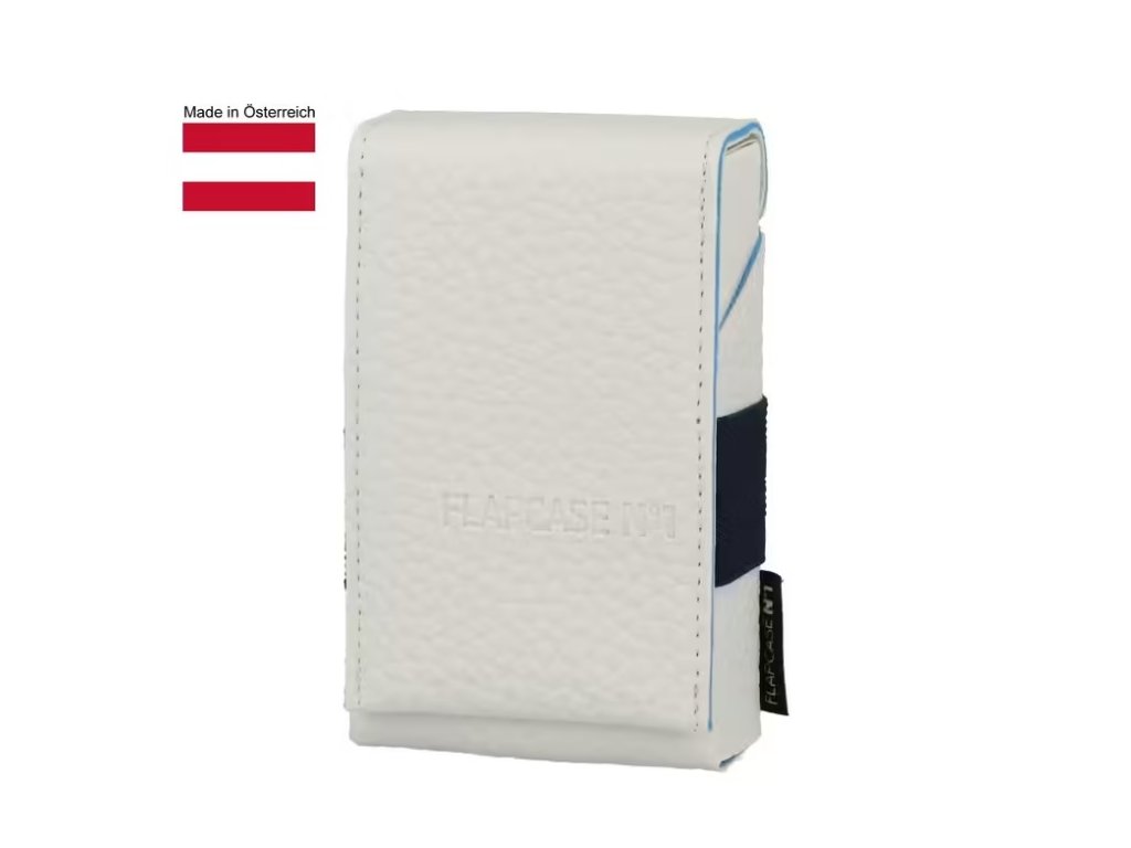 Elegantní kožené pouzdro na cigarety s gumou na zapalovač ručně vyrobené v Rakousku. Praktické pouzdro Flapcase No.1 na celou krabičku cigaret klasické velikosti King Size (80 mm) je vyrobené z kvalitní kůže. Povrch v bílé barvě má jemnou texturu. Vypadnutí krabičky je zajištěno zapínáním pouzdra na magnet. Po celém obvodu pouzdra je guma, díky které můžeme uchytit zapalovač, který je nedílnou součástí kuřáka cigaret. Pouzdro je dodávané v dárkové krabičce.; Vnitřní prostor pouzdra pro krabičku (Š x H x V): 55 x 22 x 91 mm; Celkové rozměry (Š x H x V): 60 x 32 x 96 mmDoplňkové parametry