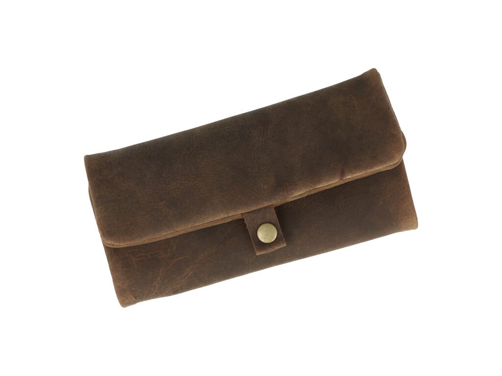 Kožené pouzdro na tabák Angelo RYO s balící podložkou. Praktické pouzdro na tabák je ručně vyrobené z pravé kůže a je ve tmavě hnědém provedení. Matný povrch pouzdra je hladký. Po rozevření pouzdra najdeme menší kapsu na papírky a dvě velké kapsy, které můžeme použít na tabák a filtry. Při balení cigarety nám pomůže balící prohnutá podložka ze dřeva a pěchovací tyčka pro naplnění cigarety, které jsou současní vnitřního prostoru. Celé pouzdro se zavírá na jeden patent.Rozměry složeného pouzdra (Š x H x V): 155 x 45 x 80 mm