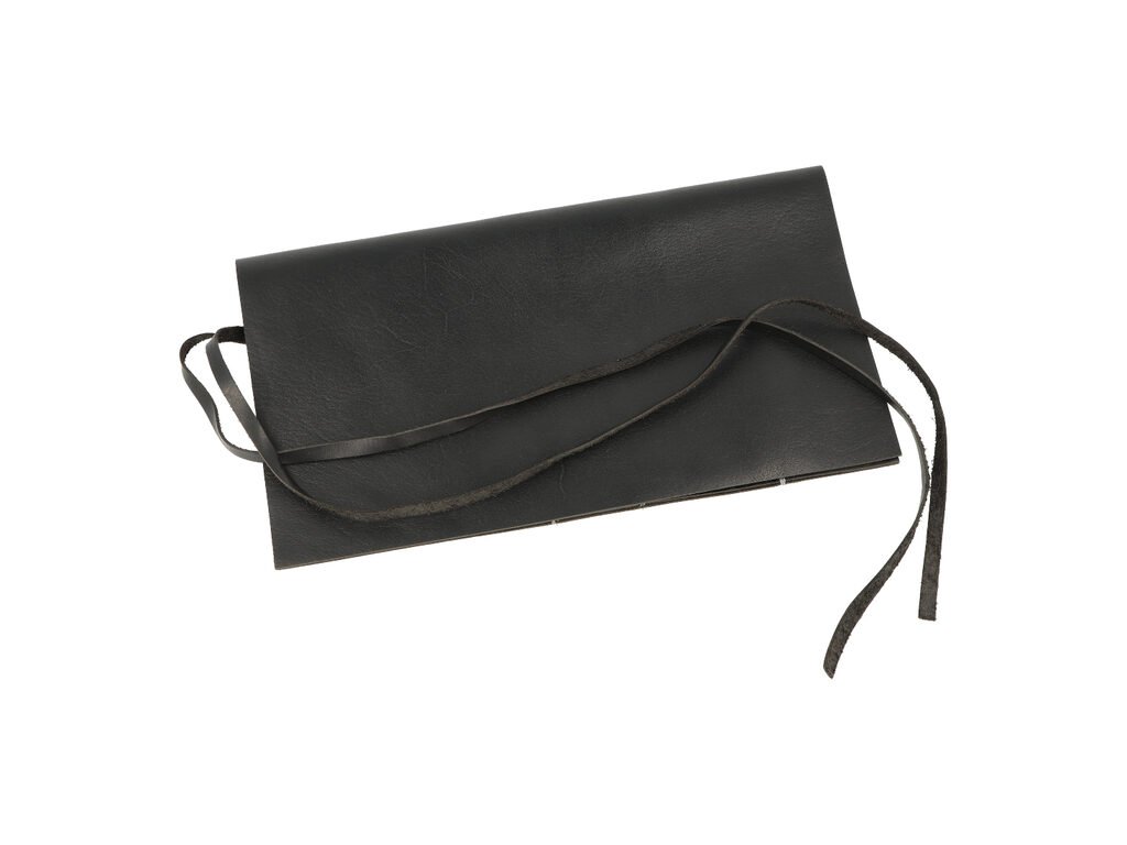 Černé kožené pouzdro na tabák MM. Pouzdro má povrch v polomatném provedení s jemnou strukturou. Po rozevření najdeme v levé části větší kapsu na tabák a další tři menší kapsy pro kuřácké potřeby jako jsou papírky, filtry apod. Pouzdro uzavřeme přeložením a převázáním koženým páskem. Pouzdro je dodávané v igelitovém sáčku.Rozměry zavřeného pouzdra (Š x H x V): 225 x 15 x 125 mm