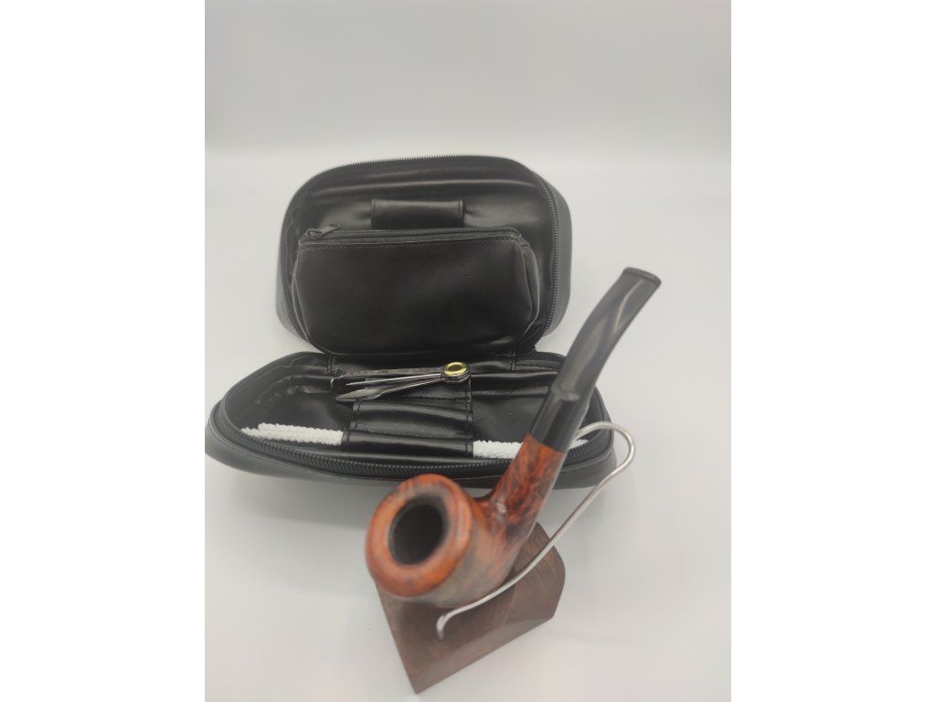 Sada pro kuřáky dýmky - startovací set. Dýmková sada obsahuje bruyerovou dýmku Angelo s filtrem 9 mm, koženkové pouzdro na dýmku, ťapťátko, tři dýmkové filtry a čističe dýmky. Dárková sada je vhodná jako dárek pro začínajícího kuřáka dýmky, kterým jistě uděláte radost. Zobrazený stojánek není součástí balení dýmky.; Zahnutá dýmka Angelo s filtrem 9 mm je ve tmavě hnědém provedení s jemnou kresbou. Na boční straně dýmky najdeme rytý nápis "Angelo". Hlava dýmky je pololesklá, černý akrylátový náustek lesklý. Filtr do dýmky: 9 mm; Délka dýmky: 145 mm; Výška hlavy: 47 mm; Šířka hlavy: 39 mm; Průměr tabákové komory: 19 mm; Hloubka tabákové komory: 37 mm; Hmotnost dýmky: 47 g; Druh dýmky dle materiálu: dýmka briár. Obsah balení: 1x dýmka, 1x dusátko, 3x filtry do dýmky, 3x dýmkové čističe, 1x pouzdro na dýmkuDoplňkové parametry