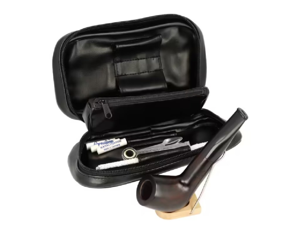 Praktická sada pro kuřáky dýmky - startovací set. Dýmková sada obsahuje rovnou briárovou dýmku Angelo s filtrem 9 mm, černé koženkové pouzdro na dýmku se zipem, nerezové ťapťátko, dýmkové filtry a čističe dýmky. Dárková sada je vhodná jako dárek pro začínajícího kuřáka dýmky, kterým jistě uděláte radost. Zobrazený stojánek není součástí balení dýmky.; Rovná dýmka Angelo je ve tmavém hnědém provedení s nevýraznou kresbou. Na boční straně dýmky najdeme rytý nápis "Angelo". Hladká hlava dýmky je lesklá, černý akrylátový náustek taktéž.; Filtr do dýmky: 9 mm; Délka dýmky: 143 mm; Výška hlavy: 52 mm; Šířka hlavy: 37 mm; Průměr tabákové komory: 18 mm; Hloubka tabákové komory: 35 mm; Hmotnost dýmky: 48 g; ;Druh dýmky dle materiálu: dýmka briár; Distributor: Fortis-DB, spol. s r.o.; Obsah balení: 1x dýmka, 1x dusátko, 3x filtry do dýmky, 3x dýmkové čističe, 1x pouzdro na dýmkuDoplňkové parametry