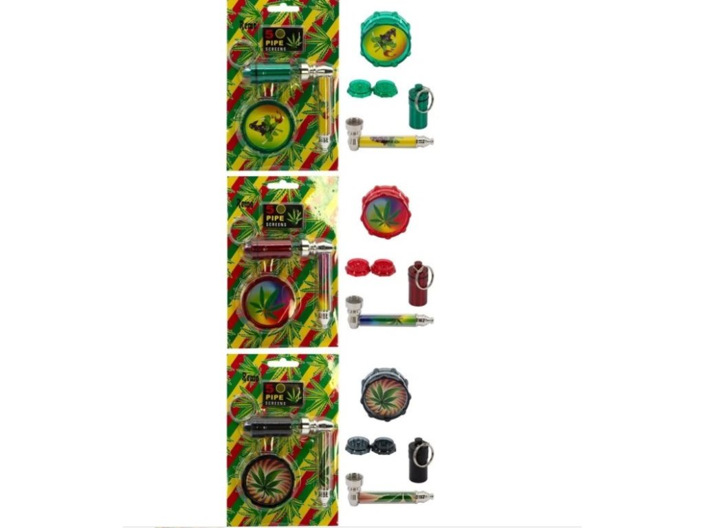 Sada zahrnuje šlukovku (87mm), drtič tabáku (50mm) a vodotěsný zásobník s přívěskem, různé dekorace.