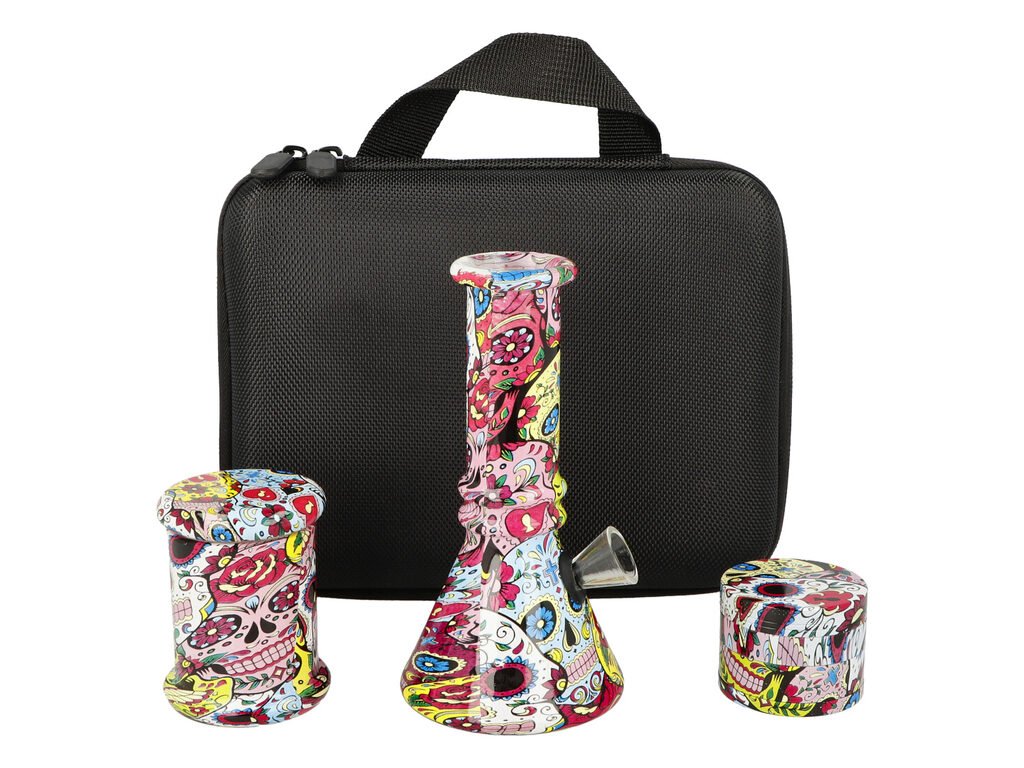 Sada skleněný bong s drtičkou konopí a schovkou. Praktická dárková sada Dreamliner obsahuje kuřácké potřeby, které nejednomu kuřákovi udělají radost. V sadě najdete malý skleněný bong z borosilikátového skla s barevným potiskem a s jednodílným chillumem. Dále čtyřdílnou kovovou drtičku a skleněnou uzavíratelnou dózu s víčkem na vaše byliny. Sada je dodávaná v přenosném pouzdru se zipem z odolné tkaniny. Díky tomu můžete mít svůj bong se všemi potřebami sebou na dovolené nebo třeba na výletě.Parametry bongu: