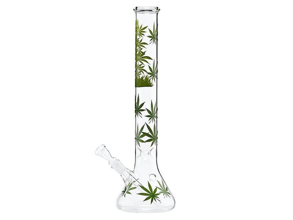 Atraktivní skleněný bong Leaf Jhari Beaker Ice. Transparentní rovný ice bong je zdobený zelenými listy konopí. Kvalitně zpracovaný bong je vybavený "výstupky" pro udržení kostek ledu, který ochlazuje kouř. Oproti standardním bongům je tento prémiový bong vyrobený z tepelně odolného borosilikátového skla. Chillum bongu je jednodílný.Výška: 45 cm