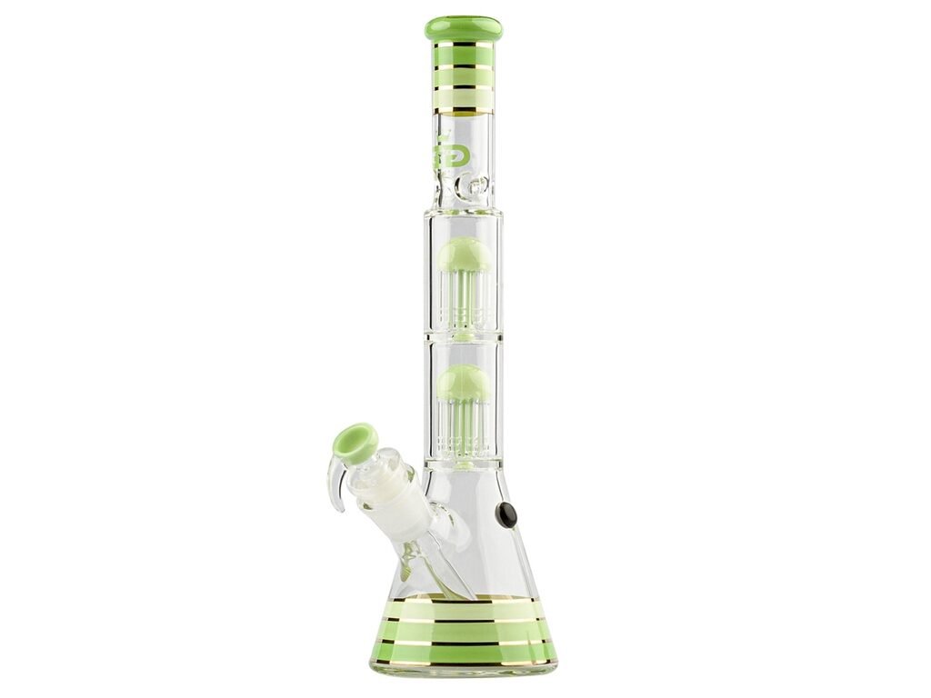 Skleněný bong s perkolací Grace Glass Golden Line Green Stripes. Rovný bong v zeleném tónu s logem Grace Glass zdobený zlatými proužky je ukončený středně silným hrdlem. Ice bong je vybavený "výstupky" pro udržení kostek ledu k ochlazení kouře a dvěma perkolacemi typu Arm s osmi rameny, která kouř dokonale rozděluje, zjemňuje a pomáhá ochlazovat. Ve spodní části najdeme zaslepený otvor pro turbo. Oproti standardním bongům je tento prémiový bong vyrobený z tepelně odolného borosilikátového skla tloušťky 5 mm. Velký dvoudílný chillum s difuzérem je ukončený samostatným kotlíkem s držátkem a otvorem cca 8 mm.Výška: 38 cm