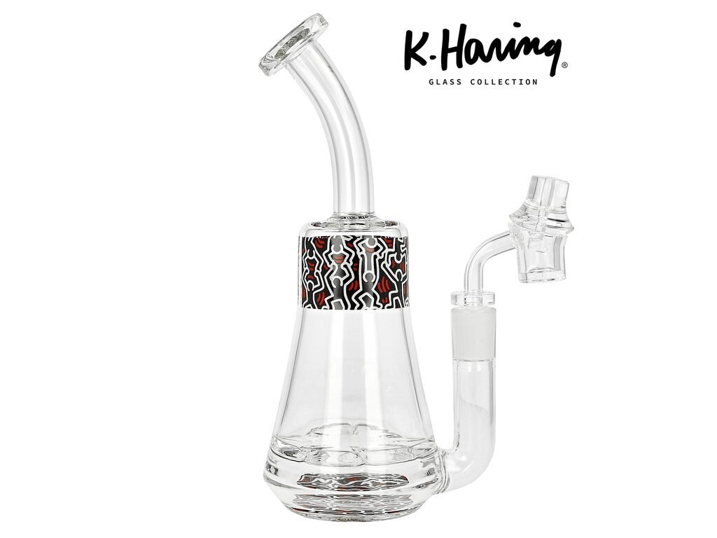 Skleněný olejový bong s perkolací Keith Haring Black & Red. Atraktivní transparentní bubbler s olejovým kotlíkem z kolekce Keitha Haringa je zdobený černo červenou grafikou známého amerického pop-art umělce. Exklusivitu tomuto bongu dává nejenom zajímavý design a precizní zpracování, ale také ručně nanášené barevné vzory a v neposlední řade podpis K. Heringa na čelní straně. Bongo ukončené slabším hrdlem je vybavené perkolací Turbine s osmi otvory, která kouř rozdělí a roztočí do spirály. Díky tomuto se kouř dokonale zjemní a ochladí. Díky dodávanému olejovému kotlíku je tento bong vhodný pro dab olejů, vosků č jiných bylinných extraktů. Po výměně kotlíku pro dabbing za běžný kotlík z něj samozřejmě můžete kouřit sušené bylinky v pevném stavu. Bong je oproti standardním bongům vyroben z tepelně odolného borosilikátového skla tloušťky 3 mm. Vestavěný chillum je ukončený pravoúhlým nástavcem s kotlíkem. Krytka olejového kotlíku se směrovým otvorem pomáhá ovládat proudění vzduchu. Bong je dodávaný ve stylové kartonové krabici s Haringovou grafikou, která díky své pěnové výplni zabraňuje poškození bongu při skladování.Výška: 23 cm