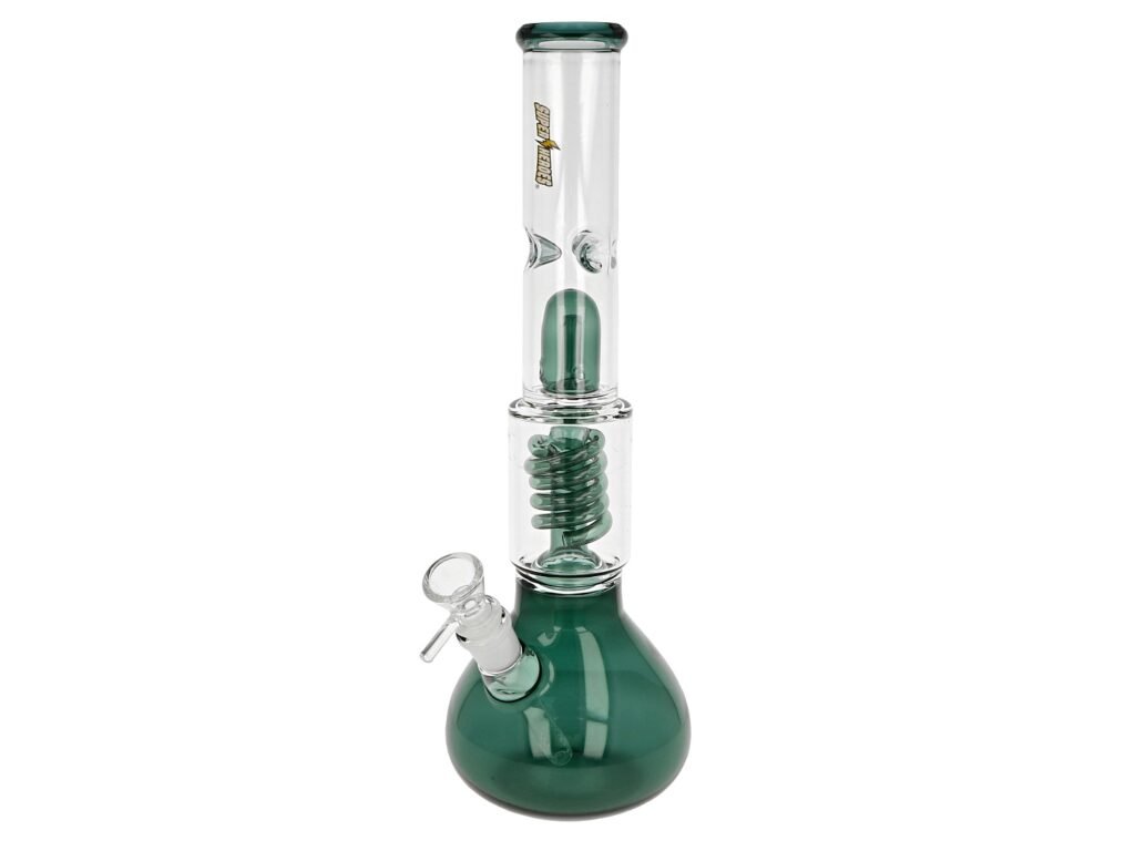 Bong s dvojnásobnou perkolací Super Heroes Bowl Transparent Ice. Skleněný bong ve tmavě zeleném tónu zdobený logem je ukončeným silnějším hrdlem. Ice bong je vybavený "výstupky" pro udržení kostek ledu k ochlazení kouře a dvěma perkolacemi typu Spiral a Dome, které kouř dokonale rozdělí, zjemní a tím ještě více pomáhají ochladit. Oproti standardním bongům je tento prémiový bong vyrobený z tepelně odolného borosilikátového skla tloušťky 3,5 mm. Dvojdílný chillum se slit difuzérem je ukončený samostatným kotlíkem s praktickým držátkem a otvorem cca 5 mm.Výška: 40 cm