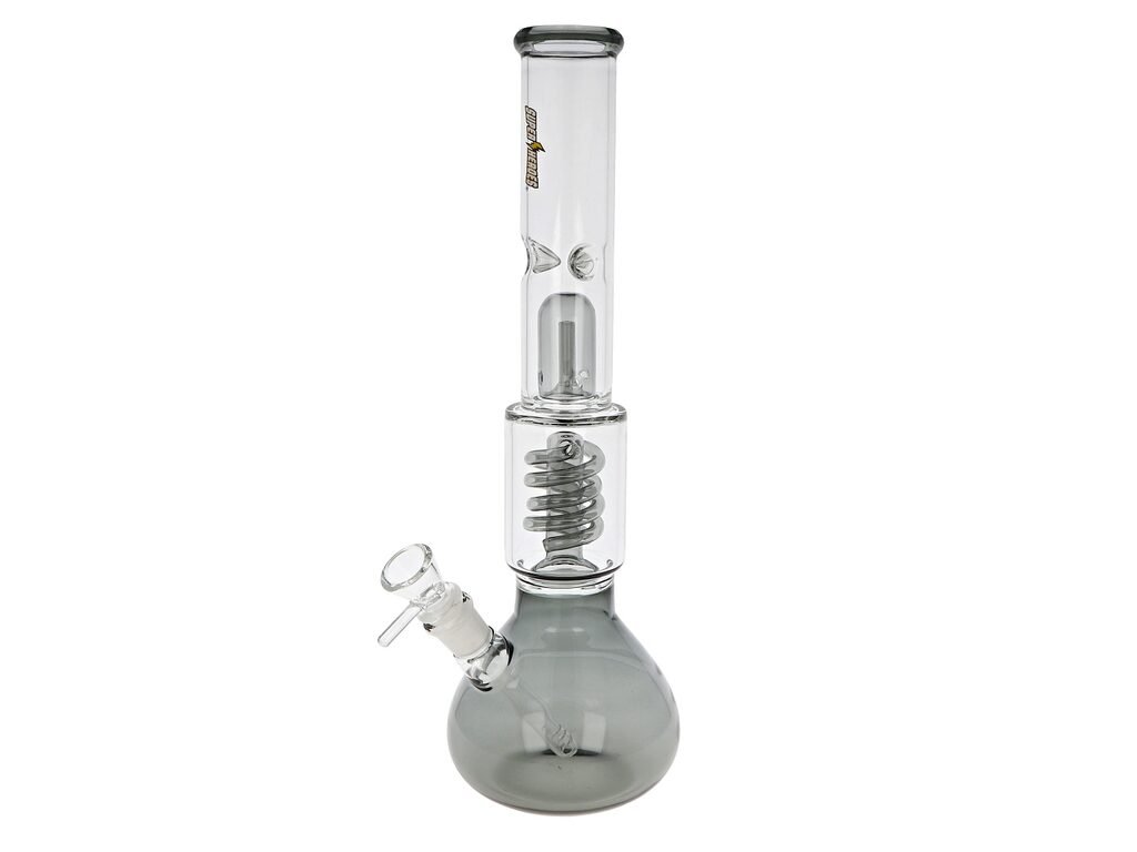 Bong se dvěma perkolacemi Super Heroes. Skleněný bong v kouřovém tónu zdobený logem, je ukončený slabším hrdlem. Ice bong je vybavený "výstupky" pro udržení kostek ledu k ochlazení kouře. Dvě perkolace Spiral a Dome kouř dokonale rozděluje, zjemňuje a pomáhá ochlazovat. Oproti standardním bongům je tento prémiový bong vyrobený z tepelně odolného borosilikátového skla tloušťky 3,5 mm. Dvoudílný chillum se slit difuzérem je ukončený samostatným kotlíkem s držátkem a otvorem cca 5 mm.Výška: 39 cm