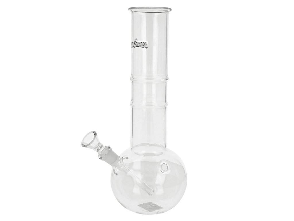 Skleněný bong Super Heroes Transparent. Rovný bong ve tvaru baňky je na čelní straně zdobený bílým logem Super Heroes. Bong ukončený tenkým hrdlem je vyrobený z tepelně odolného borosilikátového skla tloušťky 3 mm. Chillum bongu je jednodílný.Výška: 28 cm