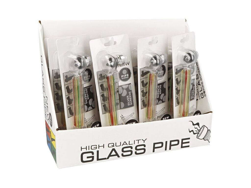 Skleněná šlukovka se sítky. Uvnitř kuřácké sady najdete silnostěnnou šlukovku s kovovým kotlem a náhradní kovová sítka. V případě čistění lze skleněnou dýmku jednoduše rozebrat a snadno vyčistit. Tělo šlukovky je vyrobené ze žáruodolného skla tloušťky 1,5 mm. Sada je dodávána v blistru. Cena uvedená za 1 ks.Balení obsahuje: 1x šlukovka, 5x náhradní sítka
