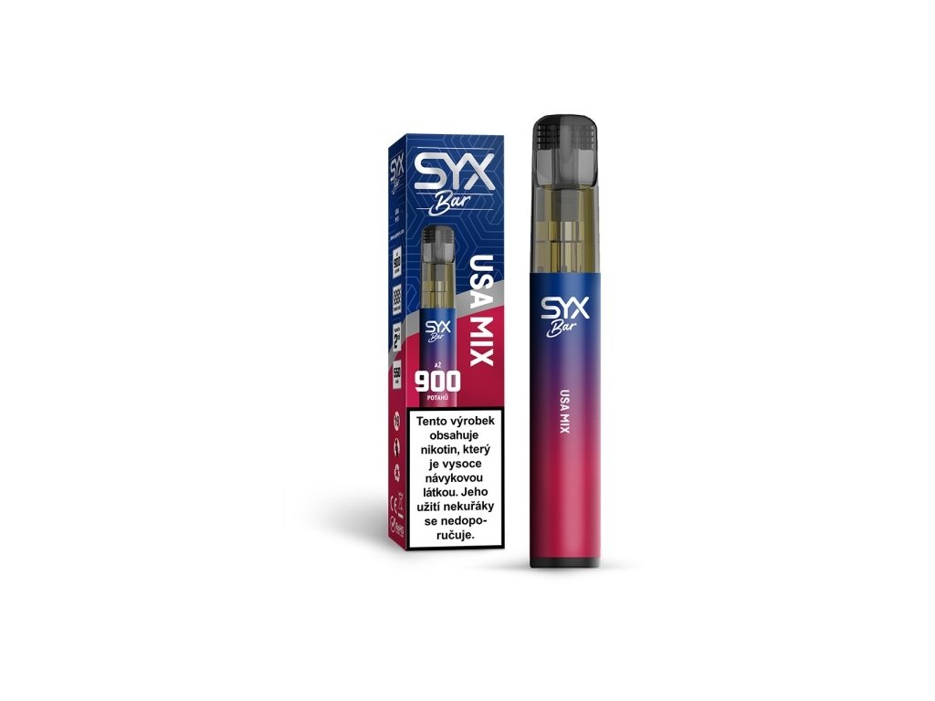 Jednorázová e-cigareta SYX BAR USA MIX s příjemnou chutí klasického tabáku. E-cigareta SYX BAR je jednorázová, není proto možné ji opětovně doplňovat e-liquidem ani dobíjet. Vydrží však neuvěřitelných více než 900 potáhnutí! Nadprůměrná výdrž je výsledkem technologií zabraňujících únik e-liquidu a také velké kapacitě baterie 550 mAh. Obrovskou výhodou je průhledná nádržka, skrz kterou je možné vidět, kolik v e-cigaretě zbývá e-liquidu. Nádržka obsahuje 2ml e-liquidu s obsahem 16,5 mg/ml nikotinové soli.Doplňkové parametry