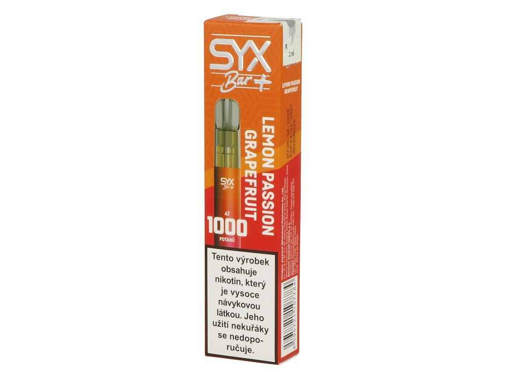 Jednorázová e-cigareta SYX BAR Lemon Passion Grapefruit Vám nabízí skvělý zážitek při vapingu v podobě chutí, které jsou všem známé z liquidů SYX. Jednorázovka s osvěžující tropickou chutí maracuji, citronu a grapefruitu Vás nadchne svým projevem a autentičnosti příchutě.Uvnitř jednorázovky SYX BAR najdete baterii 550 mAh, která zajistí dostatečnou energii pro až 1000 potahů. Kolik liquidu v jednorázovce Vám ještě zbývá, zjistíte díky průhledné nádržce, kterou SYX BAR obsahuje. Technologie Air-Oil-Parted, která je v jednorázových e-cigaretách SYX BAR použita, zabraňuje protečení e-liquidu (liquid je oddělený od airflow). Nikotinová příchuť o objemu 2 ml (NicSalt) s intenzitou 16,5 mg bude bohatě stačit nejen začínajícímu vaperovi, tak i pokročilému. Prodej pouze po celém boxu (5 ks e-cigaret). Cena uvedená za 1 ks.