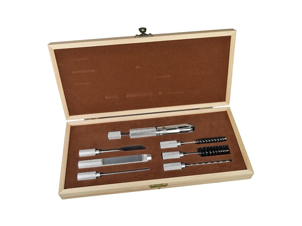Výhrubník na dýmku s příslušenstvím pro čistění dýmky. Praktická 7- dílná sada Angelo pro údržbu a čištění Vaší dýmky v dřevěné kazetě. Sada na čištění dýmky obsahuje výhrubník o možném průměru 15 až 19 mm a další potřebné nástroje pro čištění dýmky.Celkové rozměry kazety (Š x H x V): 275 x 125 x 35 mm