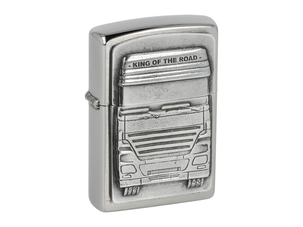 Benzínový zapalovač Zippo 21887 King of the Road. Kvalitní zapalovač Zippo s povrchovou úpravou Brushed Chrome. Povrch bočních stran zapalovače je v High Polish Chrome, přední strana je zdobená kovovou 3D plaketou s kamiónem a textem King of The Road. Zapalovač dodáváme v originální krabičce s logem. Zapalovače Zippo nejsou při dodání naplněné benzínem. Originální příslušenství benzín Zippo, kamínky, knoty a vata do zapalovače Zippo, zajistí správné fungování benzínové zapalovače. Na mechanické závady zapalovače poskytuje Zippo doživotní záruku. Tuto záruku můžete uplatnit přímo u nás. Zapalovače jsou vyrobené v USA, Original Zippo® Bradford.Distributor: Fortis-DB, spol. s r.o.